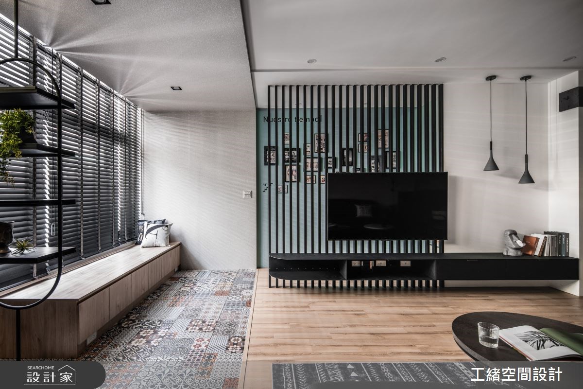 一家四口的北歐風親子宅,在一進門的地方規劃長型落塵區,地板鋪設六角磚,並設置靠窗的木質臥榻,讓人可以在此換鞋子,也能增加客廳的座位區,親友來訪時不用擔心無位可坐,聊天不受拘束。臥榻下方融入開放式的收納空間,擺放室內拖鞋,拿取超方便。