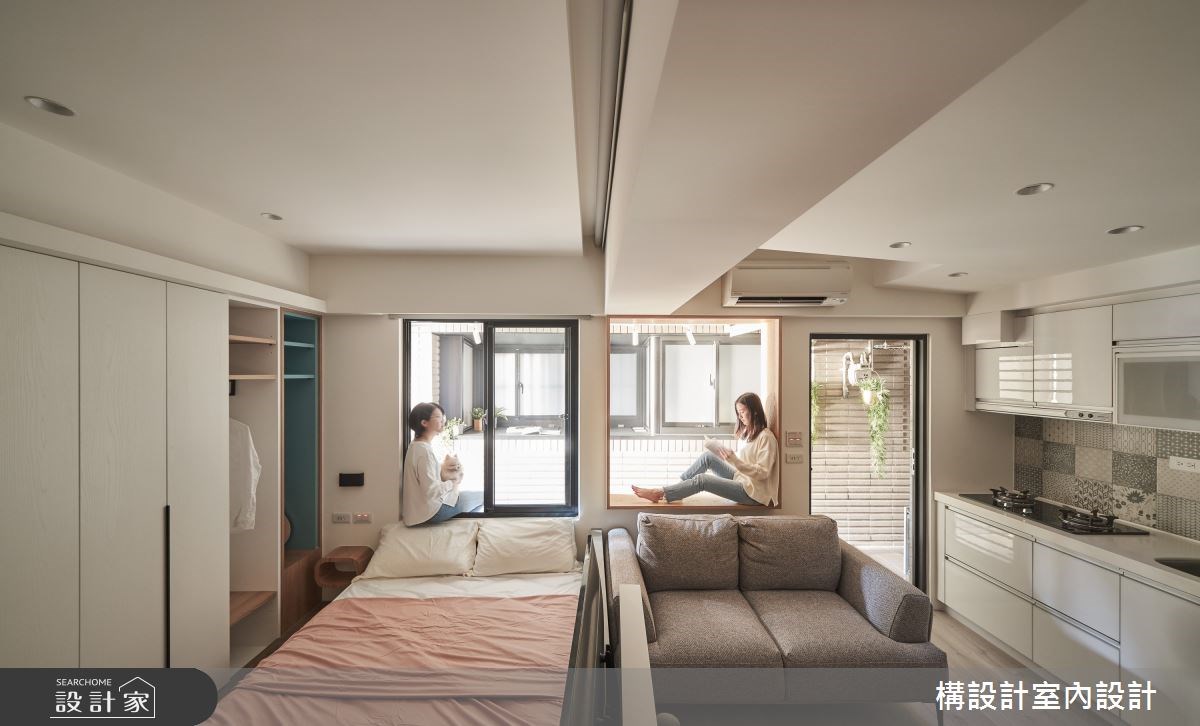 14 坪的混搭風小宅,在坪數有限的情況下,善用客廳旁的畸零空間,作為架高的臥榻區域,讓原先尷尬的居家角落,成為暫時逃離塵囂的祕密基地,簡單擺放一些移動式家具,就可以相當舒適。而且臥榻區的開窗設置,還可以將明亮的光線,引進公共空間,創造小宅的寬敞感受。