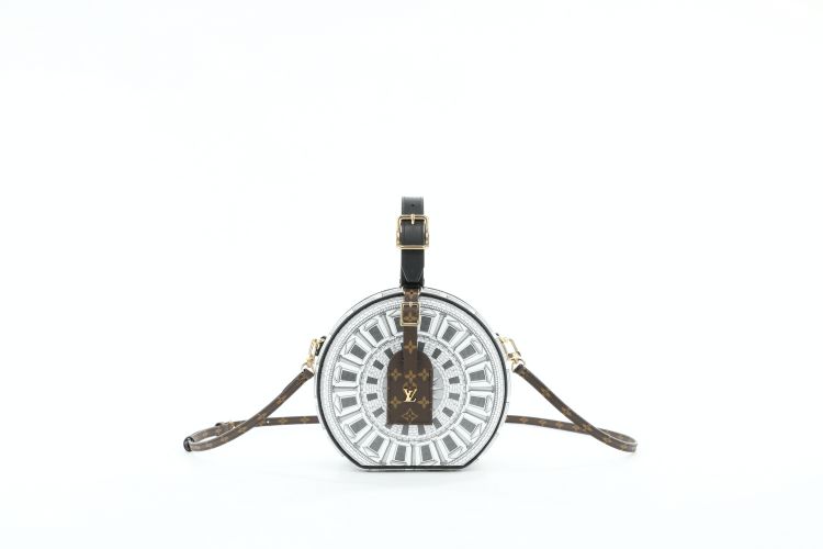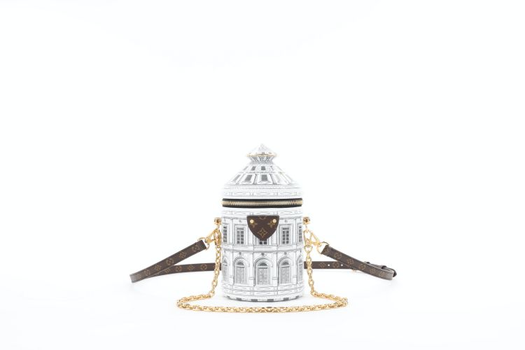 以行李箱起家的 Louis Vuitton,在訂製種特殊箱型總有自己的一套方法!近年品牌將過往設計用來裝帽子的行李箱縮小推出的「Petite Boîte Chapeau」包款,因包身外型被戲稱為圓餅包, 這次設計師延其獨特線條,並注入 Fornasetti 的建築畫作,讓這款包變得更具裝飾性