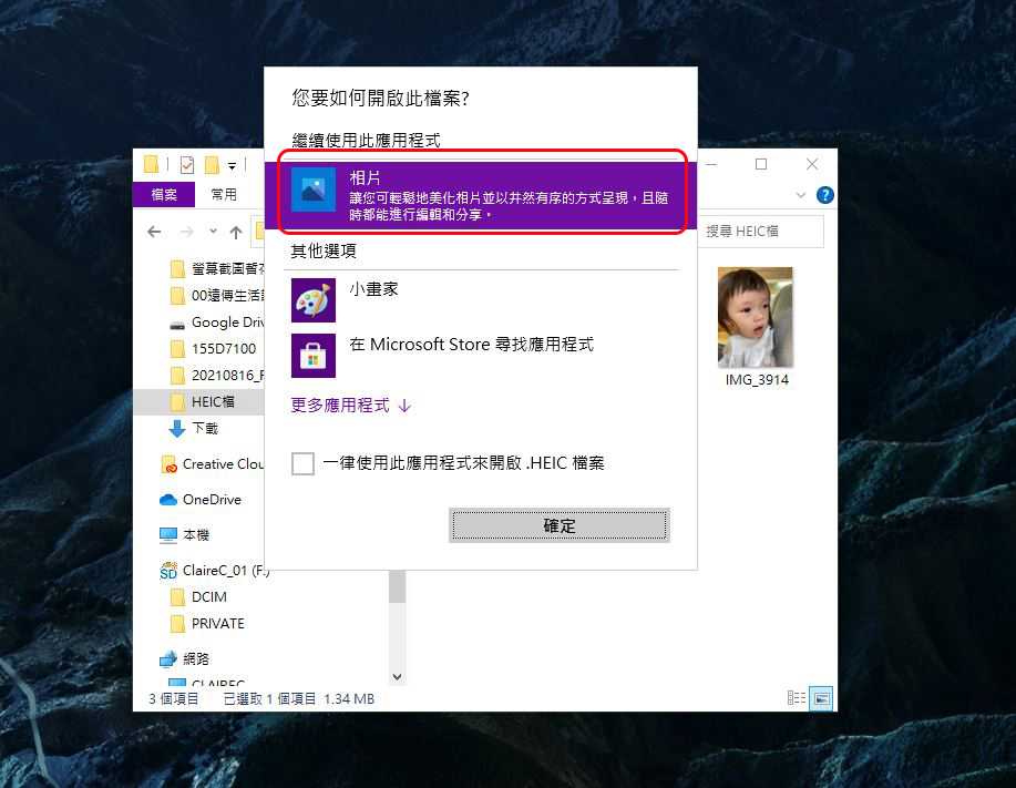 一般情況下,你若想要直接用 Windows 內建的相片來打開 HEIF / HEIC 檔案,系統通常無法開啟並且告訴你必須下載安裝擴展,就連縮圖也看不到。你只需到 HEIF Image Extension 的 Microsoft 線上商店中取得並安裝該免費擴展模組,然後點選啟動。雖然按下啟動後,看起來沒有任何變化,但是接下來你會發現原本顯示不出來的縮圖有了!當你再次雙擊想要瀏覽的檔案並且選擇「相片」應用開啟後,影像也能正常地打開。