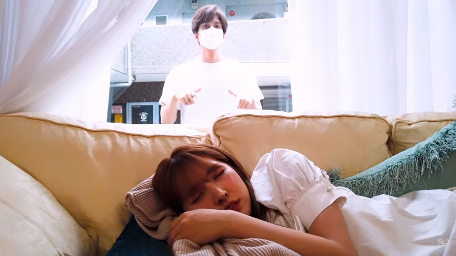 在拍攝時,她便動起來了!在鏡頭前面邊跳邊唱,到了休息時間,她似乎是太累了,便直接在沙發上休息睡著!然而可愛的捲曲式睡姿與熟睡的樣子被攝影師記錄下來,網友們在看到後喊:「我可以躺你旁邊嗎?」