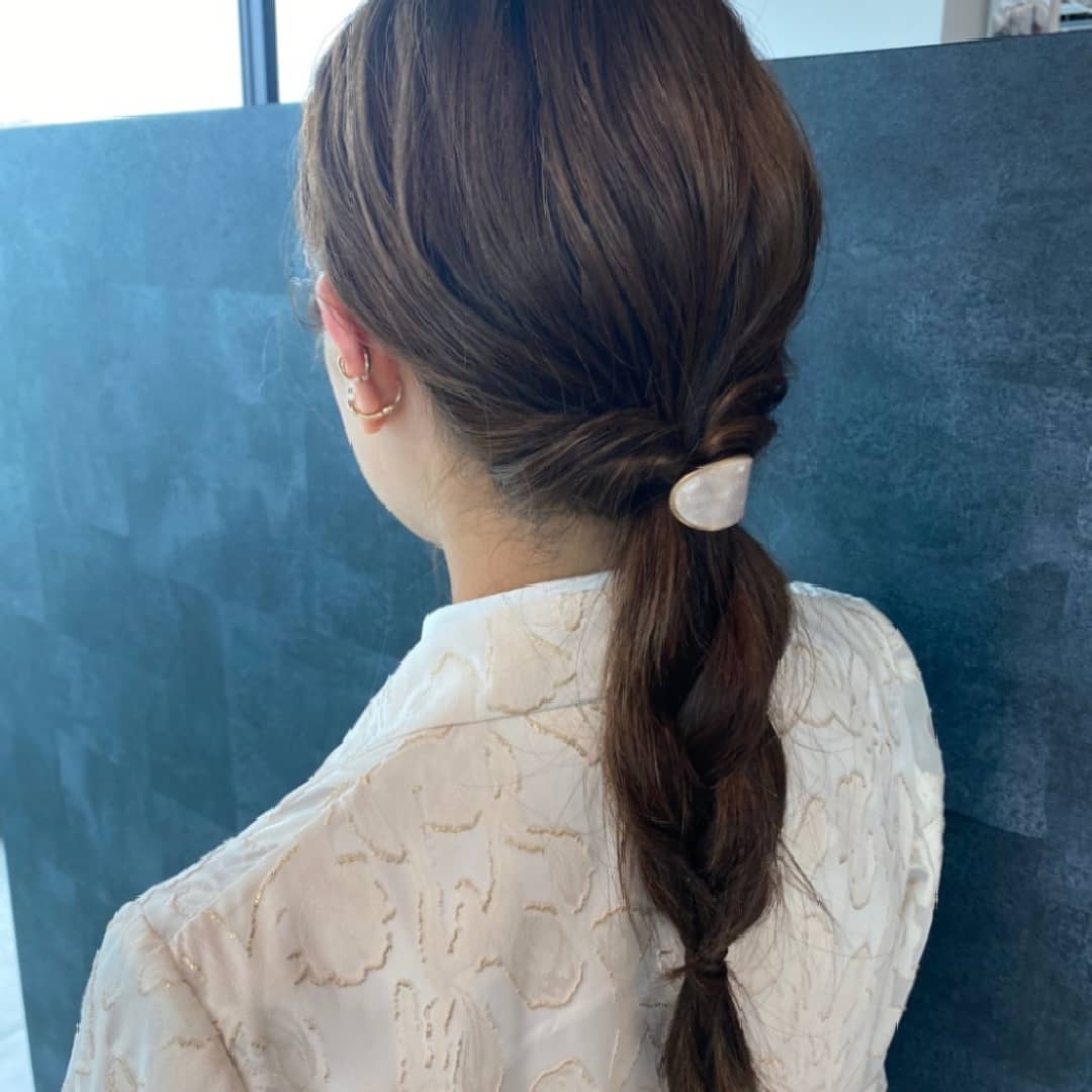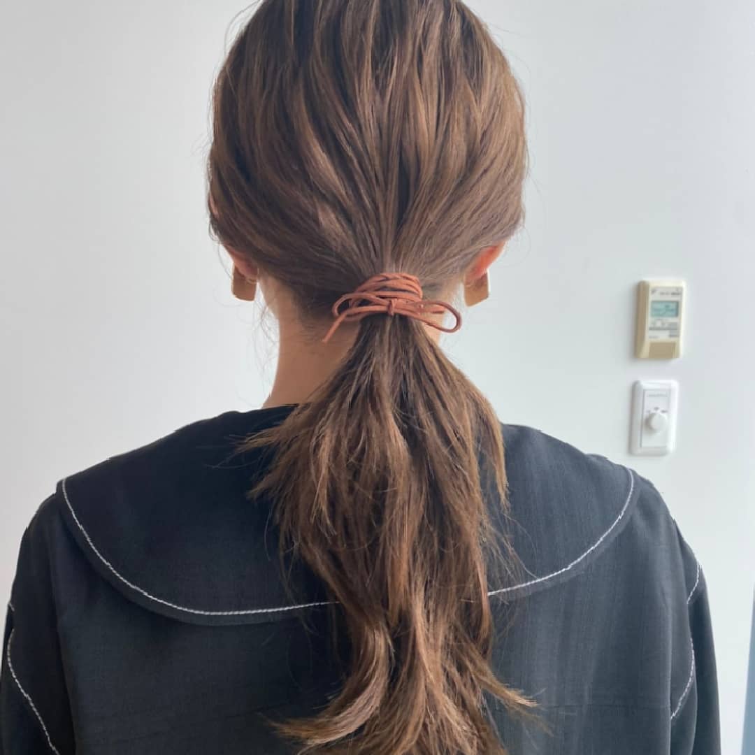 除了基本的馬尾造型,你也可以利用綁髮繩紮出俐落感。首先紮好整齊、緊實的低馬尾後,可以透過綁髮繩以交叉纏繞在馬尾上,讓馬尾顯得更乾淨、率性,無論是搭配套裝、小洋裝,又或者度假風穿搭都更顯個性有層次感。