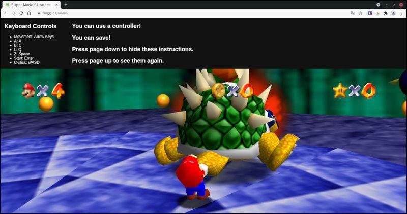 根據這個將原始碼一類的文檔託管在 Github 上的 n64decomp 計畫,有個高手低調的做出了網頁版的《超級瑪利歐64》。操控方面,筆者以 Linux 系統下的 Chromium 瀏覽器開啟,可以看到網頁上敘述著操控遊戲的按鍵指令。例如 N64 上的 ABLZ 四鍵分別對應到鍵盤上的 X、C、Q、空白鍵四個按鍵,搖桿的操控以上下左右四向按鍵替代,而轉動攝影機的 D-Pad 鍵則由 WASD 四個按鍵擔當。有了這些操控方法,其實在電腦上已經可以直接開玩: