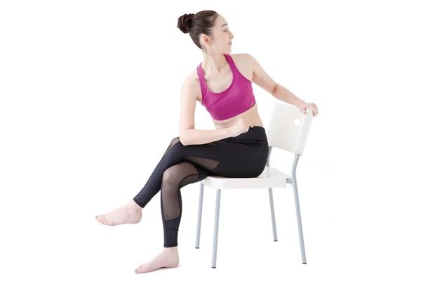 把另一側的手肘放在上面那隻腳的膝蓋上,另一隻手抓著椅背,腰部~上半身往會痛或會麻的那一邊向後旋轉。維持這個姿勢不動1∼3分鐘,次數以一天進行1∼3次為準。做這個動作時,手腕和腳都不要使力,想像腰椎確實在往後旋轉,效果尤佳。