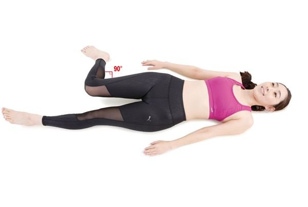 在地板仰躺下來,將會痛或會麻的那隻腳的膝蓋往外彎曲90度(圖示為右腳會痛或會麻的情形)。如果彎成90度的「L型」有困難,只要彎到不逞強的程度即可。維持這個姿勢不動1∼3分鐘,次數以一天進行1∼3 次為準。當臀部的疼痛、發麻、不適感特別嚴重時,可以隨時進行。做這個動作時,放鬆下半身的力氣,想像是在舒展僵化的肌肉,效果尤佳。
