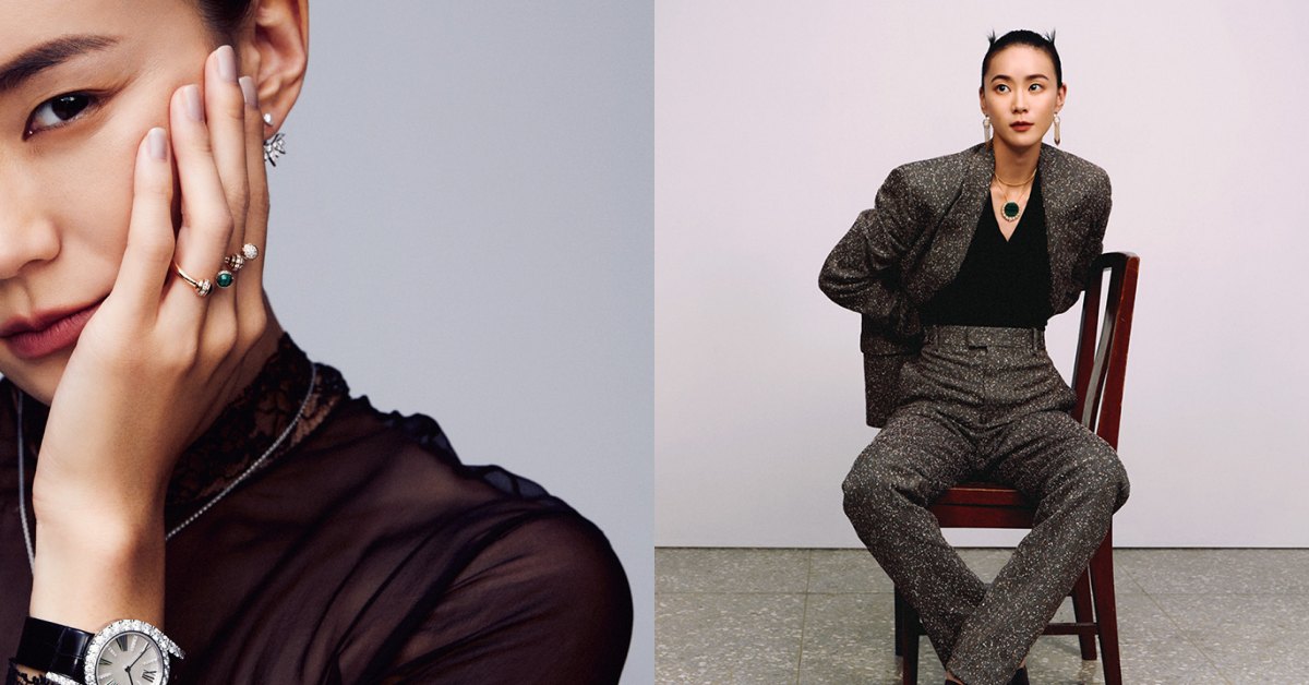 襯衫、西裝外套,both by Dior;玫瑰金鑽石耳環、寬戒、玫瑰金鑽石戒指、孔雀石及鑽石戒指、鑽石戒指;all by Piaget。