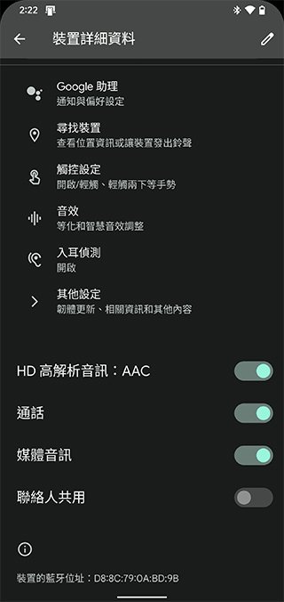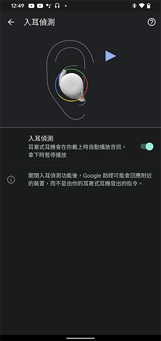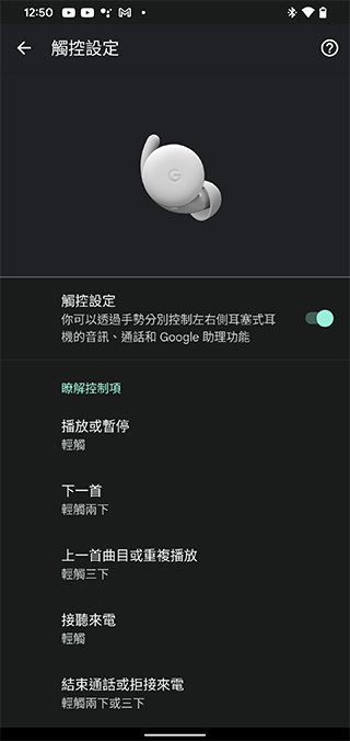 入耳偵測功能主要用於偵測目前耳機是否在你的耳朵上,當這項功能開啟時,只要你取下耳機,音樂播放會自動暫停,直到你戴上耳機才會繼續播放。在觸控設定部分你可以選擇關閉或開啟手勢控制,也可以從這裡更了解 Pixel Buds A-Series 可支援的手勢指令。