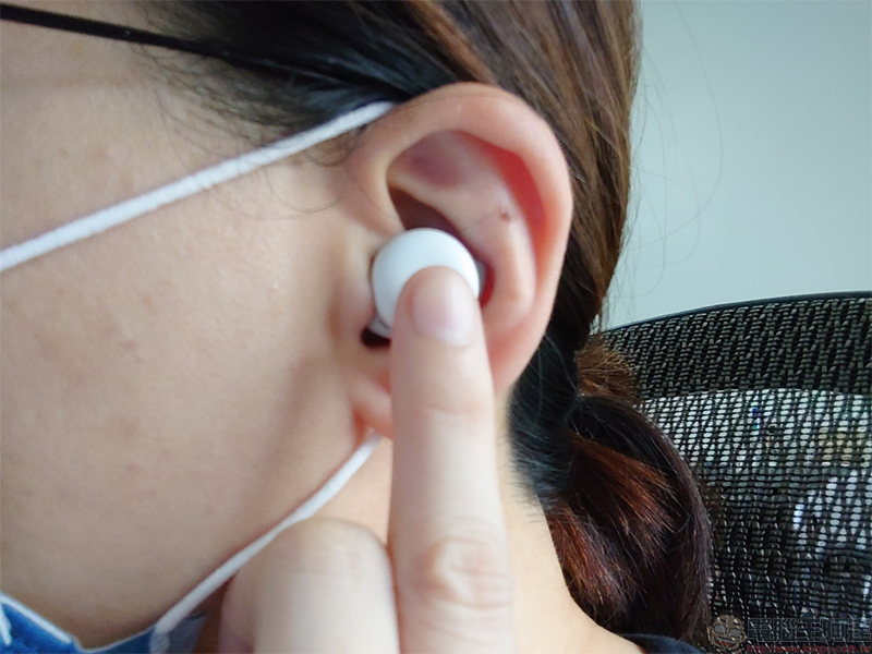 整個圓形外面板就是 Pixel Buds A-Series 的觸控區,你可以輕點一下、兩下、三下來控制音樂播放、接聽 / 掛斷電話等。比較可惜的是它並不具備之前 Pixel Buds 2 上面的直接音量控制,所以你還是必須用手機才能將音量放大或減少。