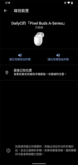 耳機因為身形小,忽然找不到似乎是很容易發生的事情。就像我們在家找不到手機,會撥打後讓其發出聲響聽音辨位,尋找裝置功能可以呼叫耳機發出音效,且哪邊找不到就呼叫哪邊,讓你更容易找到不知丟哪去的耳塞。另外,如果你是整組不知丟哪,還可以查看最後的連線位置,給你一個找到它的大方向,這點在外出時特別方便。