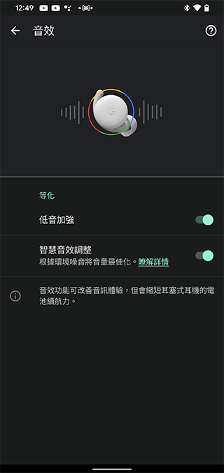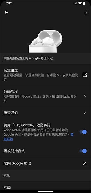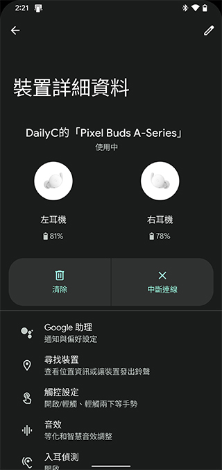 在專屬的應用程式《Pixel Buds》中,你可以查看目前耳機的電量外,還能夠從中設定語音助理、觸控手勢、音效與韌體更新等,還有音效與入耳偵測是否啟用等功能。
