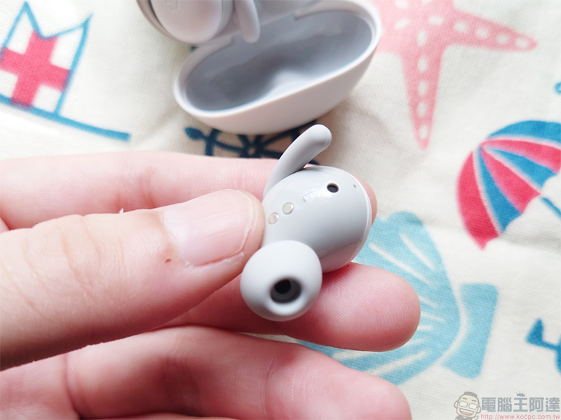 從外觀上看,其實與過去的 Google 自家真無線藍牙產品差異不大,同樣走的是圓潤、可愛的設計,具備可以在運動時強化固定的鰭片,整體外形上不像市面上許多真無線藍牙一樣會凸出於耳廓之外,它更能牢靠地貼合你的耳朵,加上隨附可自由選擇的三組不同大小耳塞(一組已經裝在耳機上),配戴上舒適度頗高。