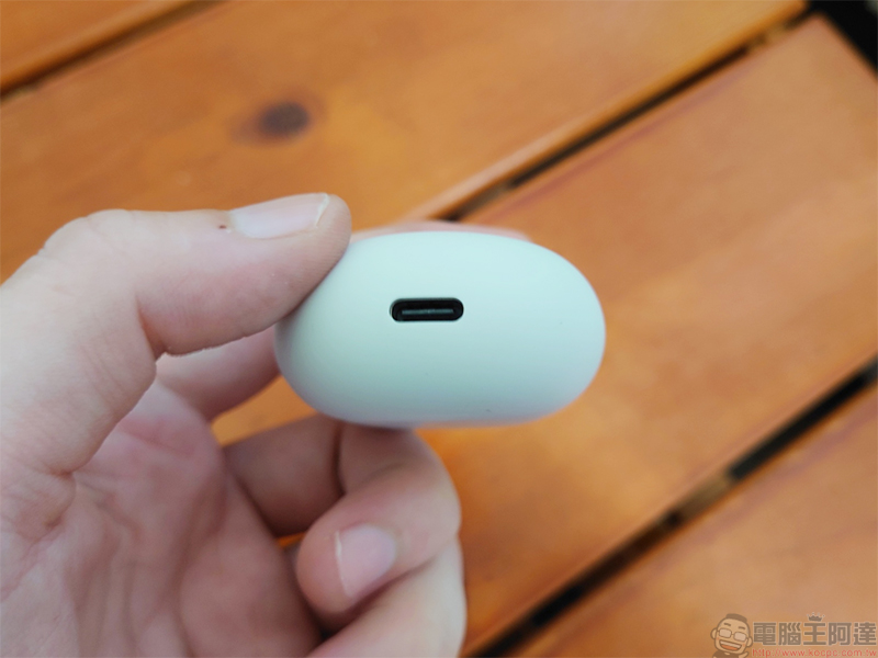 不過這一款的充電收納盒並不具備無線充電功能,在盒底配有 USB - C 連接埠可進行充電。在盒身正面配有狀態顯示燈,可藉由燈號來了解 Pixel Buds A-Series 的連線狀態與充電盒目前的電量。