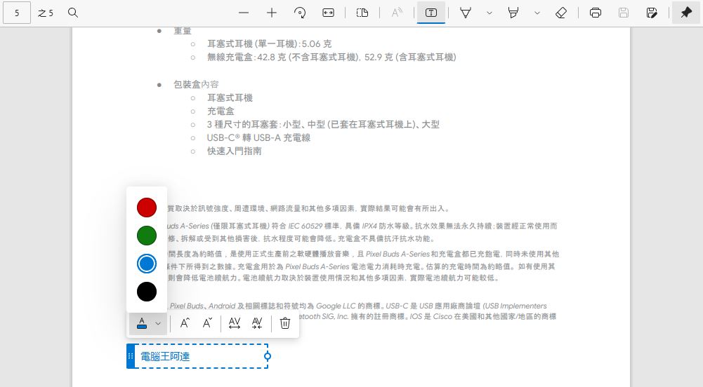 不過微軟確實收到使用者的意見回饋,現在已經開始在 Microsoft Edge Canary 版本上面測試可直接在 PDF 上新增自訂文字方塊的功能。在上方工具列可以看到小小的「新增文字」圖示,點擊後,你可以自由拖曳文字框的擺放位置,還可以自訂輸入文字的顏色、字體大小與間距。編輯完成後你可以直接存檔、列印或透過電子郵件發送出去。