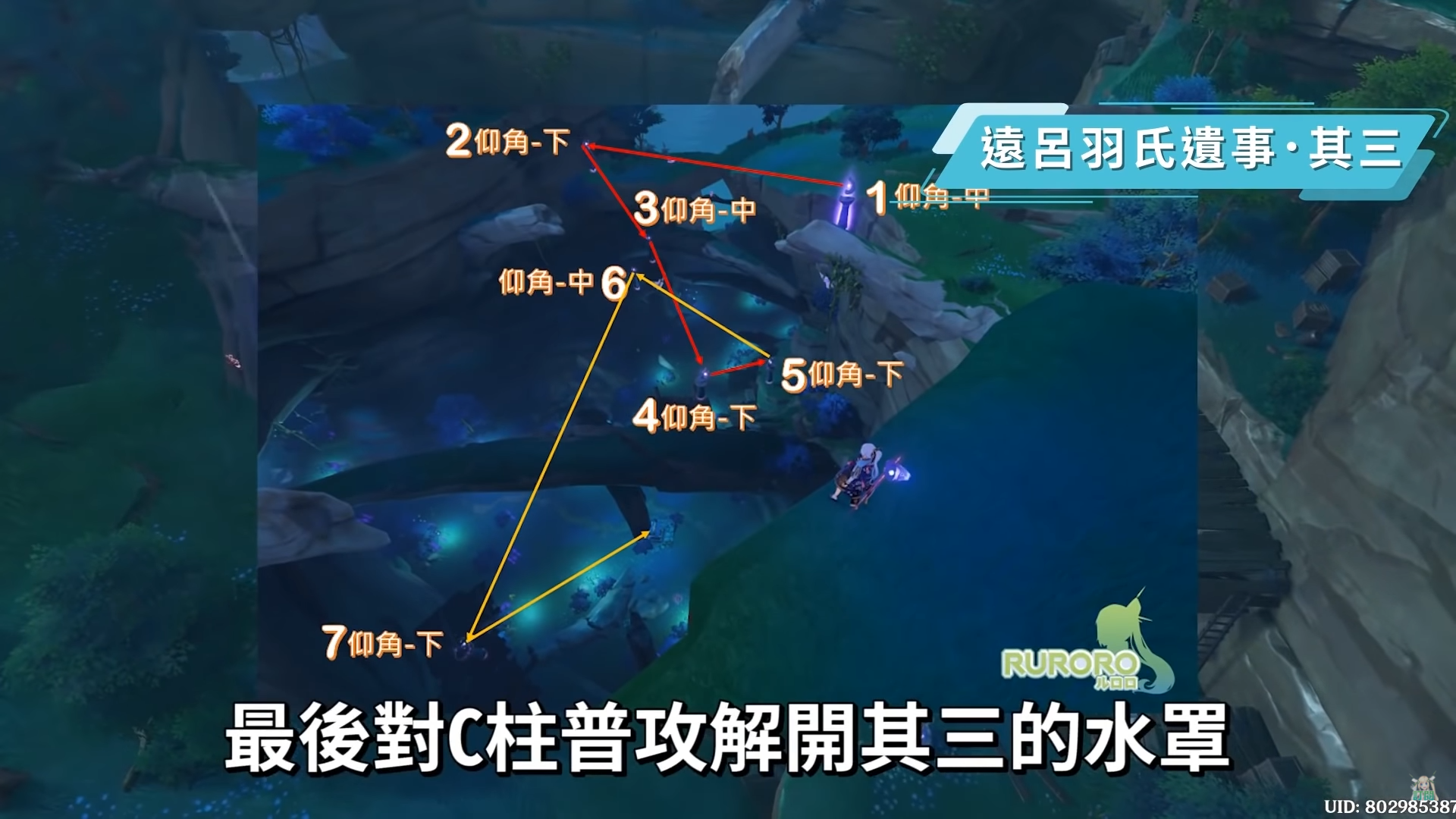 接下來其三要去蛇骨礦洞找鎮物,也是一個很複雜又有高低差的解謎機關,一樣先找到C柱起點,若是還沒有解過長次的任務的話,C柱剛好在長次的位置後面,接著按照圖片的方向和角度,最後對C柱普攻解開其三的水罩,可以看到在水罩中心的鳴神磐柱,接著用元素視野來搜尋鑲珠和鎮石。