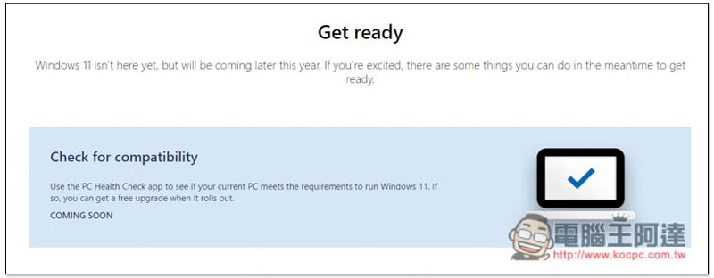 稍早微軟公布 Windows 11 最低系統要求規格的更新文章中,也同步宣布重新上架電腦健康情況檢查工具,不過原本的頁面還沒更新,依舊寫著 COMING SOON 的字樣: