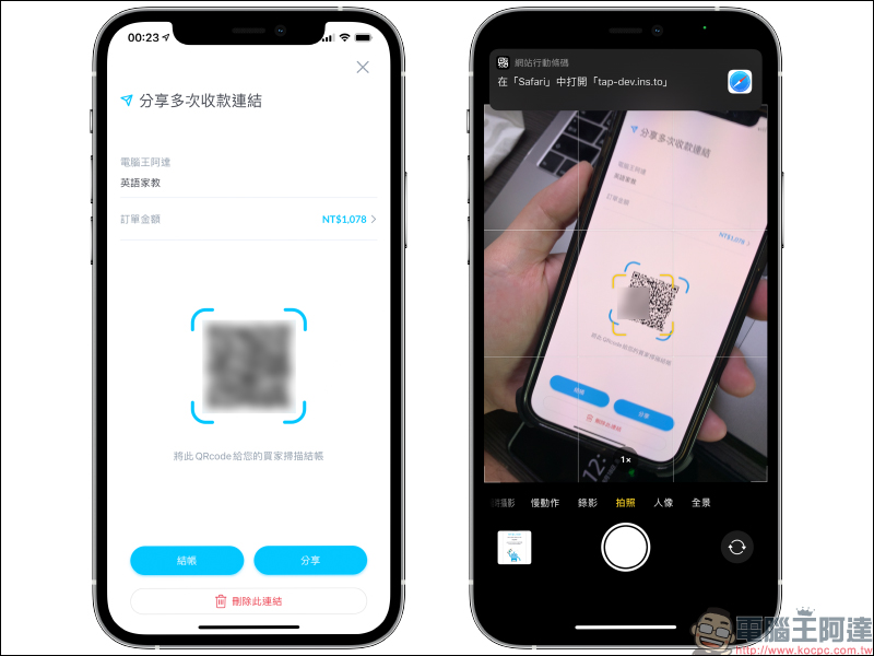 若消費者在現場能直接掃碼,可直接用手機出示收款連結給對方在手機直接掃碼進入結帳畫面。假如未在現場,則可點選分享按鈕將結帳連結傳送給消費者進行線上信用卡刷卡。