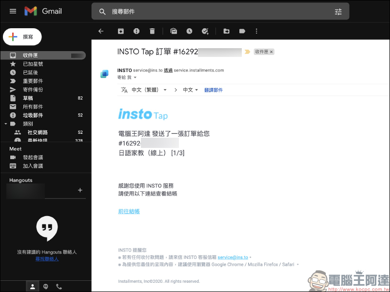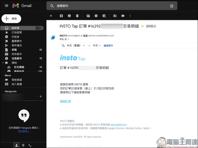 在客人付款後系統也會發送已付款完成的通知信件,讓客人也能記得自己已完成付款步驟。