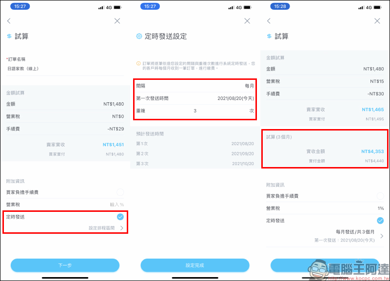 針對像是線上家教課程這種會分成多筆在定期收款的需求,則可在收款設定開啟「定時發送」功能,系統將會依照賣家設定的期數與排程規劃,定期發送收款通知給顧客。簡單來說,這其實就類似定期定額、分期付款的概念。