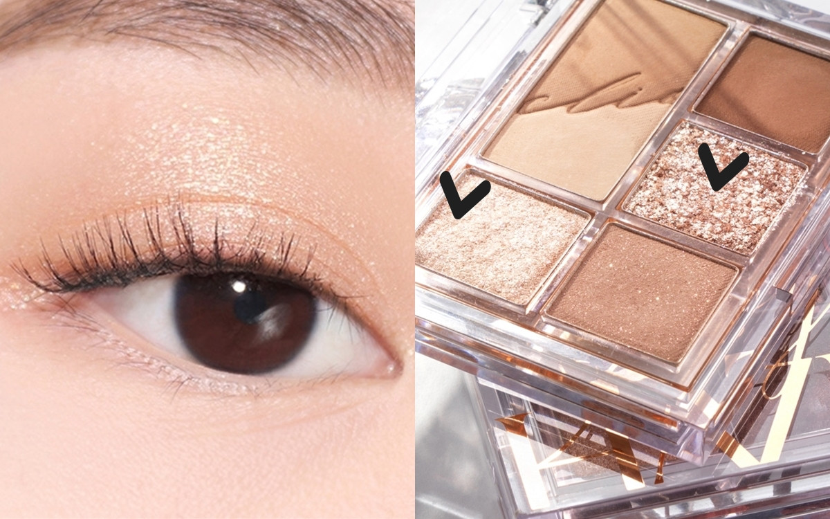最後就是提亮珠光色,很多新手怕顯腫泡、不太會用珠光色調,其實最後加上珠光色眼影,可以讓眼部的輪廓感更鮮明,也讓整個眼影明暗變化更有層次,只要注意範圍及珠光大小,其實不太會有腫泡的問題。