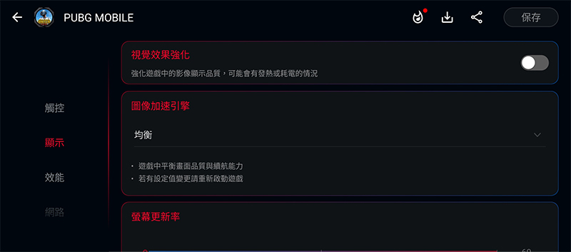 效能項目裡面可以針對每款遊戲選擇不同的效能模式、是否關閉背景 CPU運算以及記憶體優化,在中間圖示更能即時看到在設定狀態下的耗電程度。在效能模式中包含與系統設定相同、電競調校與硬核調校三種,設定完成保存後,下次你啟動該遊戲時,系統會自動套用專屬的效能模式設定檔。