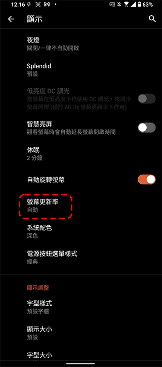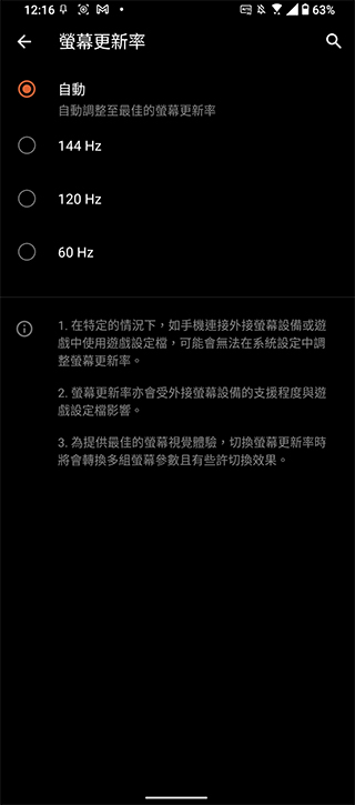 在螢幕更新率部分預設為自動模式,可依照你目前手機使用而切換至最佳頻率,當你遊戲時自動提升最高至 144Hz,日常使用時降低,以節省電量消耗。不過在設定裡面你也可以手動切換到高或低更新率,端看個人使用習慣而定。