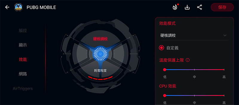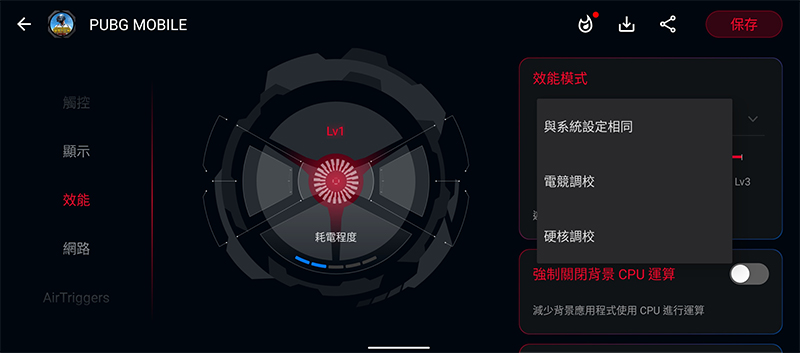 電競調校模式中有三段式效能強度可選,當然相對地就是必須付出更多的電量來支應手機的強力運轉,在最高模式時搭配動力空氣扇 5 來使用更能將潛力徹底發揮出來。