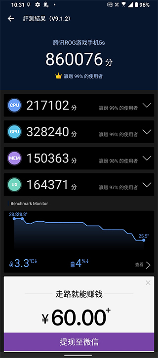 既然搭載全球最強悍擁有 18GB RAM 的高通 Snapdragon 888+ 5G 處理器並且在散熱機制部分用盡巧思的 ROG Phone 5s Pro 是以遊戲、電競為強項,在硬體與效能調校方面自然下足功夫,效能表現自然不在話下。在這次拿到手機後,筆者用各種跑分軟體來針對它進行一系列的測試。首先可以看到安兔兔的測試成績直接衝上了 860,076 分,一開始就讓人大受震撼;在進行安兔兔 HTML5 的測試成績也有 71,676 分。