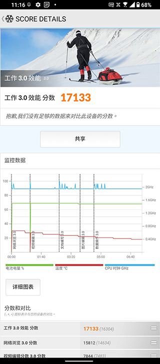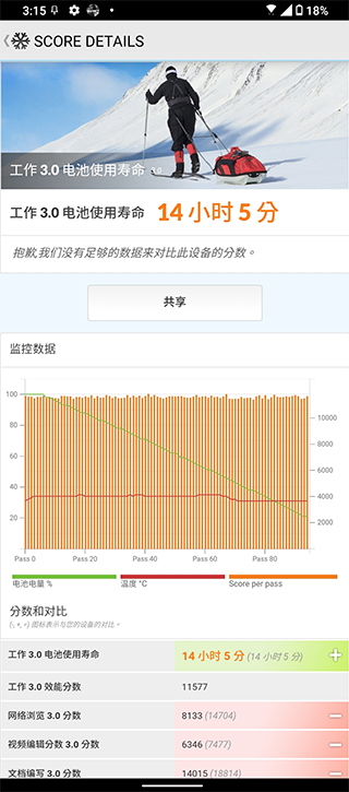 至於利用 PCMark 的工作 3.0 模式進行效能測試,得到 17,133 分也是相當不錯。ROG Phone 5s Pro 內部搭載 6,000mAh 電池,同樣的工作 3.0 中測試續航力,可達到 14 小時 5 分鐘,算是相當持久,外加上可支援 65W 快充、QC5.0 快充和 PD 充電,你需要的電量,火速為你加滿。