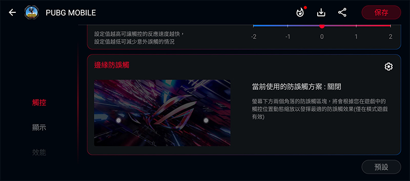 進入設定檔的觸控項目中,你可以針對滑動靈敏度、滑動精準度、觸控靈敏度與邊緣防誤觸等項目進行調整,以符合你的遊戲習慣。