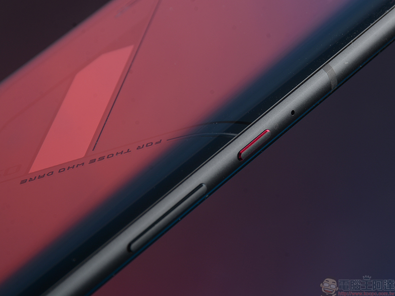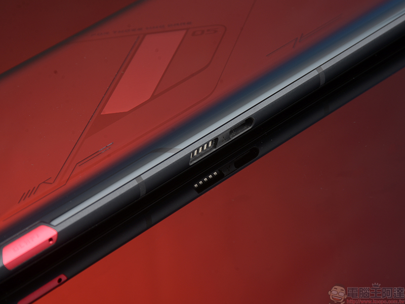 此外,相信大家在一邊玩遊戲一邊充電時,不管是橫向或直向都一定會被充電線卡手,在 ROG Phone 5s Pro 上特別在機身左側配置了 USB-C 充電孔,旁邊則是裝上空氣動力風扇 5後,從手機向風扇供電的 POGO PIN 接點,平日以橡膠塞阻擋以防入塵。