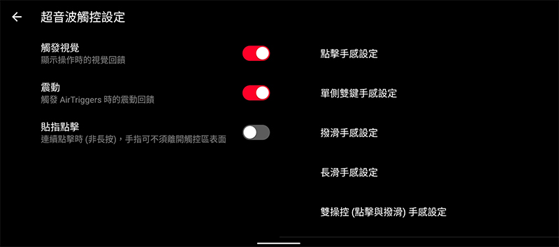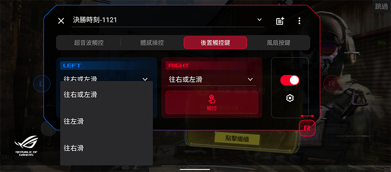 ROG Phone 5s Pro 中搭載有超音波觸控鍵、體感感測器以及後置觸控鍵與風扇專用鍵,從遊戲精靈中可以針對這些控制器以個人的使用習慣為準進行詳細設定,包含手感、回饋、觸發細節等。