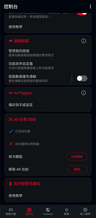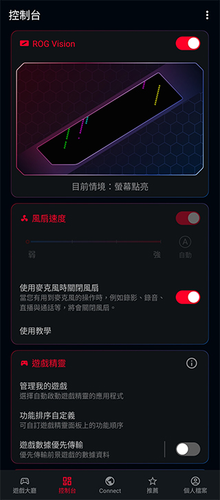 從控制台分頁裡面,你可以監看整部手機目前的概況,包含系統、CPU、GPU 目前的溫度值、剩餘電量、儲存空間與已使用的記憶體。此外還可以查看與編輯手機運作模式下更細部的參數設定並快速切換效能、風扇速度、AirTriggers 偏好等功能。