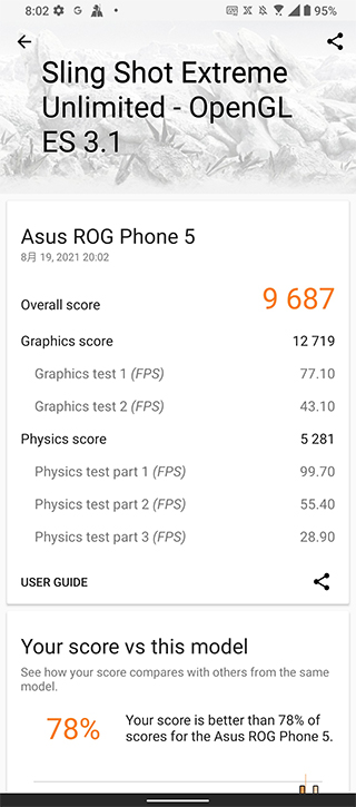 在 3DMark 測試中,Wild Life Unlimited 模式測試得分為 5,920 分,Sling Shot Extreme Unlimited - OpenGL ES 3.1 模式測試中拿下 9,687 分,相當驚人。