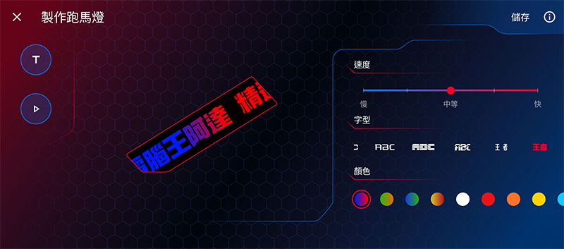 如果你想傳達的文字比較多,在跑馬燈編輯裡面,可以輸入最多 20 個中、英文字與符號,並且選擇跑馬燈的速度、字型和顏色,不管是想要嗆聲、示愛還是單純表達自我,通通都可以做得到!