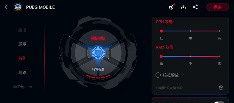 如果你是個進階型玩家,對於手機硬體各細節效能有更高的追求,硬核調校會是你的最佳選擇。在硬核調校中,你可以針對更細部的溫度保護上限、CPU 效能、GPU 效能、RAM 效能進行全部手動調整,還可以解放核芯將效能催到底。