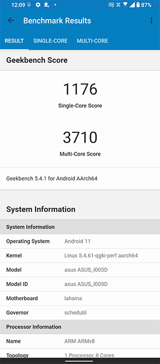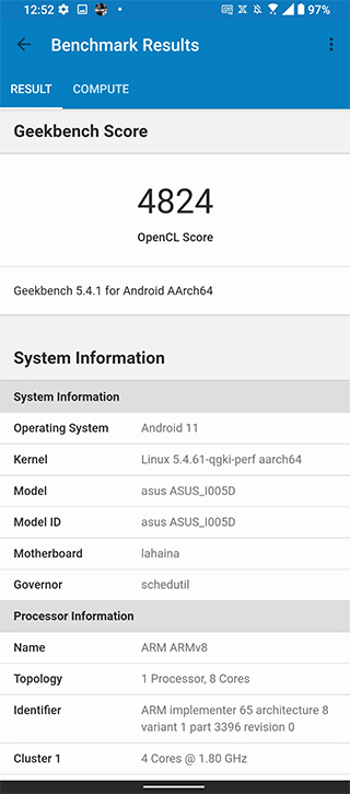Geekbench 5 的 CPU 跑分單核 1,176,多核分數則有 3,710 分;對整部手機的測試分數達 4,824 分。