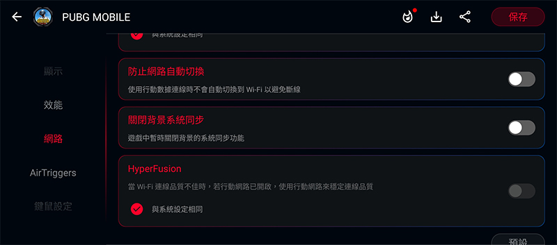 在網路設定項目裡面除了可以選擇是否自動切換 5G 、防止網路切換與遊戲中關閉背景系統同步之外,有一個很重要的就是 HyperFusion 設定。這一項開啟後,可同時連線至 Wi-Fi 和行動通訊網路,當原本連接的 Wi-Fi 網路品質不佳時會智慧切換到行動網路來維持遊戲的穩定進行,反之亦然,絕不讓你忽然斷網、卡頓、中離。