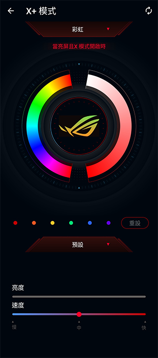 當你連接動力空氣扇 5 一起使用時,控制台中的設定項目也會跟著變動,因應冷卻系統的增強,X 模式升級為 X+ 模式,原有的 ROG Vesion 會被 Aura 系統光所取代。由於空氣扇上配了一個好閃的 RGB LOGO 燈飾,在這裡可以設定燈光的顏色、各種情境的色光模式等。