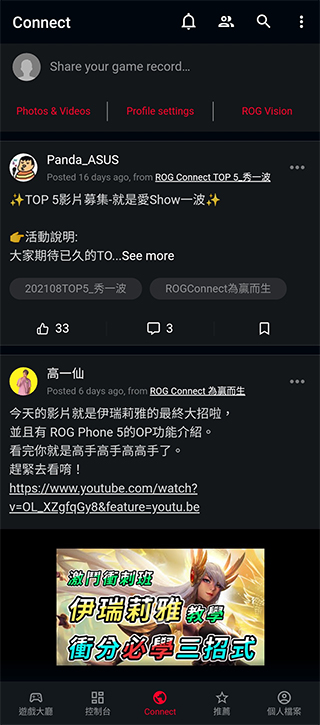 從 Armoury Crate 你還可以從 Connect 分頁進入到官方論壇與其他用戶進行遊戲交流,推薦分頁中則可以看到近期最熱門、效果最棒的手遊等,將遊戲與用戶體驗相關全都融入其中,一站就能找到所有玩家最想要的功能與服務。