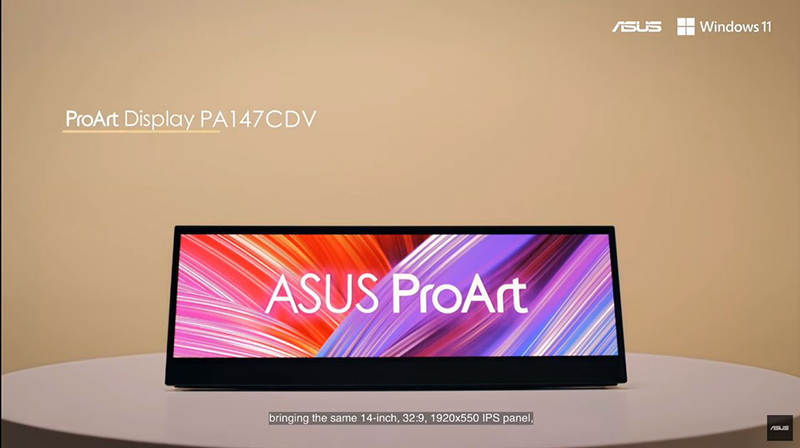 ProArt Display PA147CDV 採用 14 吋、32:9 IPS 面板,並通過 Calman 認證,可搭配筆電擴展視野,提升創意專業人士行動生產力。螢幕配備 ASUS Dial 與虛擬控制面板,可在相容的 Adobe 軟體上進行微調、改善流程以優化創意工作 。同時此款螢幕亦具備 100% sRGB 與 Rec.709 色域,並預先校準提供 Delta E < 2 的色彩準確度。10 點觸控面板亦支援 Microsoft Pen Protocol 2.0 (MPP) 技術,帶來便利的觸控功能。連線功能方面,兩個 USB-C 連接埠可透過單一纜線供應音訊、視訊及電源輸入,另有HDMI連接埠可連接各種輸入源。為便於外出使用,PA147CDV 還具備專利腳架設計,可隨時隨地提供舒適的螢幕瀏覽角度與工作位置。