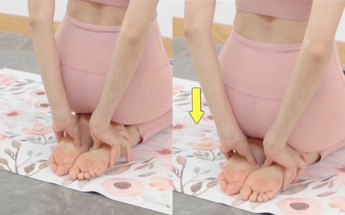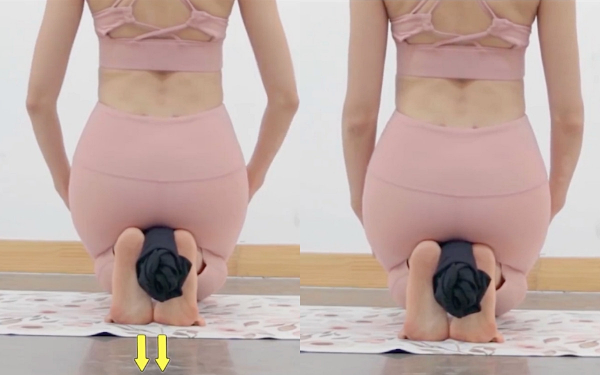 用雙手稍微轉動腳背往內、讓腳底版直直往上、帶動小腿整個往內收,盡量讓雙腳腳跟併攏,再將臀部向下坐,注意整個腳背均勻平舖地板,一樣維持15秒。