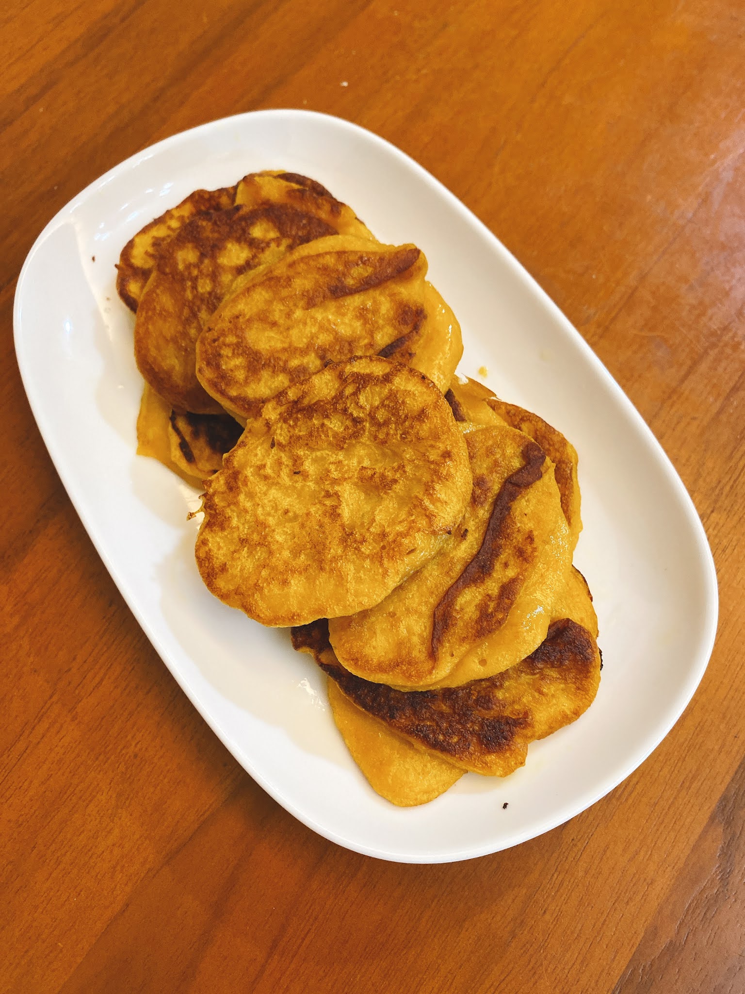 小編這次用800g的南瓜泥+200g的低筋麵粉+一顆蛋,大約可以煎15片。