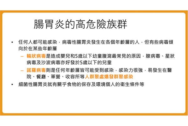 另外,葉秉威醫師指出,除了飲食傳染,接觸感染以及飛沫傳染,也是腸胃炎的傳播途徑,若沒有戴上手套、口罩,就去處理感染者的嘔吐物、排泄物,可能會因為接觸後沒有清洗乾淨,又碰到自身的粘膜,如眼、口、鼻等,而造成感染。所以,腸胃炎不只會從飲食傳染,也要特別注意是否有飛沫傳染,以及接觸傳染的危險。