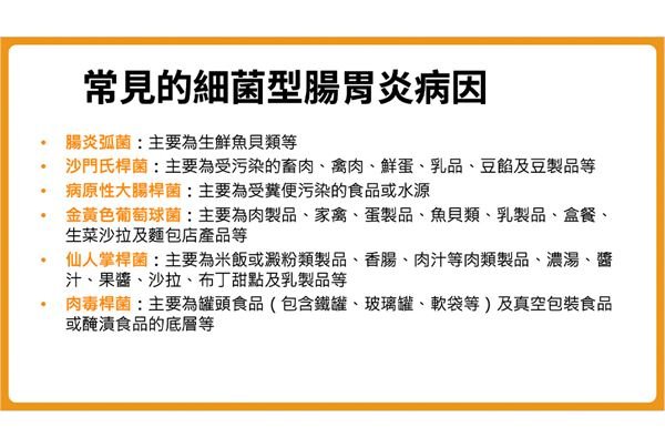 引發腸胃炎的常見細菌包括腸炎弧菌、沙門氏桿菌、病原性大腸桿菌、金黃色葡萄球菌、仙人掌桿菌以及肉毒桿菌等;其中,如果生鮮魚貝類沒有妥善烹煮,或是使用砧板時,沒有做到生、熟食分開,容易造成腸炎弧菌的感染;而大家常聽到的沙門氏桿菌,可經由帶菌的人、貓、狗、蟑螂、老鼠等途徑污染水源或污染肉、蛋、奶類等食物感染,在臨床上很常見;夏天大家愛吃的涼麵,以及受糞便感染的水源中,容易出現大腸桿菌超標的情形;金黃色葡萄球菌為人體皮膚、毛髮上常見的細菌,常見於化膿的傷口,若身體有傷口,再去烹煮食物,或是食物沒有經過充分烹煮,容易受到金黃色葡萄球菌的感染而產生症狀。