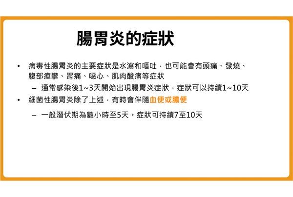 感染腸胃炎後的主要症狀包括腹瀉、嘔吐,也可能會發生頭痛、發燒、腹部痙攣、胃痛、噁心及肌肉痠痛等非特異症狀,通常在感染後1–3天開始出現症狀,可能會持續1–10天。