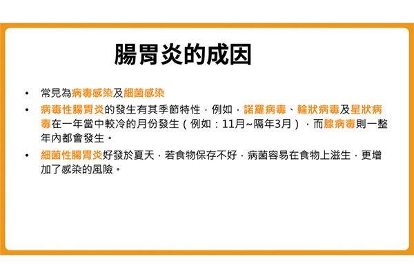 葉秉威醫師表示,腸胃炎通常分為病毒感染所引起的「病毒性腸胃炎」,以及因為把滋生過多細菌的食物吃下肚,所引起的「細菌性腸胃炎」,另外有少部分為寄生蟲感染所致。會引起病毒性腸胃炎的病毒,不外乎為大家常聽到的諾羅病毒、輪狀病毒,以及較少見的星狀病毒;這些病毒好發的時間,約在冬天轉春天之際(約11月至隔年3月),也是急性腸胃炎的好發時間;而腺病毒所引起的腸胃炎,則全年都有可能發生。
