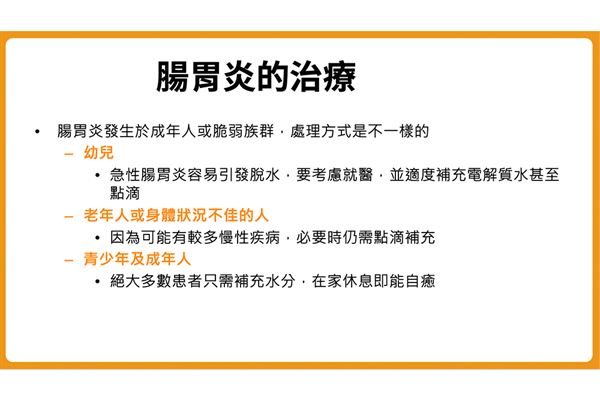 此外,老年人及臥床患者,若患有較多慢性病,在急性腸胃炎期間,也需要打點滴補充水分,腸胃炎會好得比較快;而青少年以及成年人,只要補充水分,甚至可以不用就醫,多喝水,在家裡躺個一、兩天,可能就會慢慢改善。