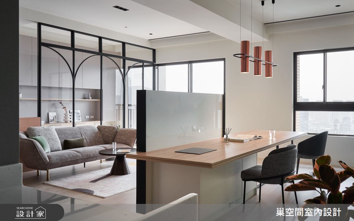 重新打造的半高電視牆,不阻礙採光及空間感,同時帶來順暢的回字型動線。依照屋主的喜好,牆面後方打造大型長桌,電視牆後方定義為書房區,半高牆替閱讀區帶來專心獨立的氛圍;轉至一旁,長型桌面又能同時轉化為多人餐桌使用,小變動卻創造了新的格局型態。