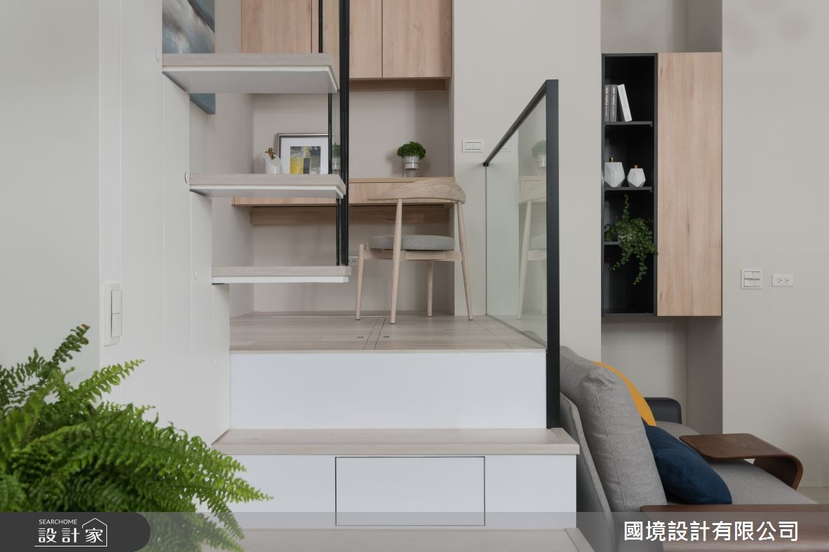 複層住宅可以多加運用樓梯的角落,例如通往二樓的小梯間,清透玻璃拉開空間視野,並妥善利用牆體深度,在轉角內凹處配置尺寸剛好的書桌,架高且面牆的安排,形成一區既開放又獨立的書房角落。