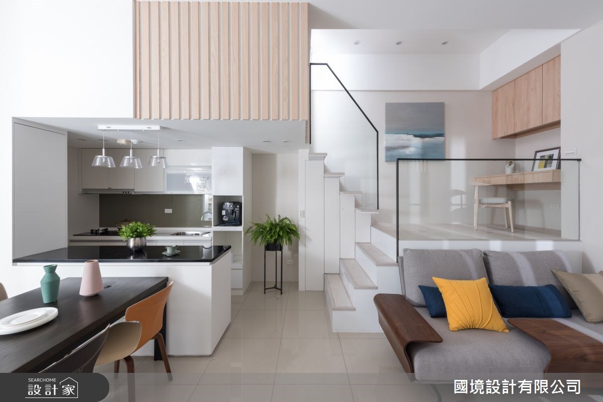 客廳電視牆不做滿,將採光面一側小區塊預留給多功能和室領域,並以木質電視牆前的木質平台延伸銜接和室墊高梯平,擴展休憩範圍,亦透過延伸桌板創造長型書桌,同時提供書房、休憩、運動伸展多元機能。